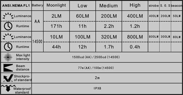 Beacon 80lm. (Power by 14500 Lithium battery) Max light intensity: 1500cd (AA) / 2500cd (14500) Beam distance: 77m (AA) / 100m (14500) Shockproof