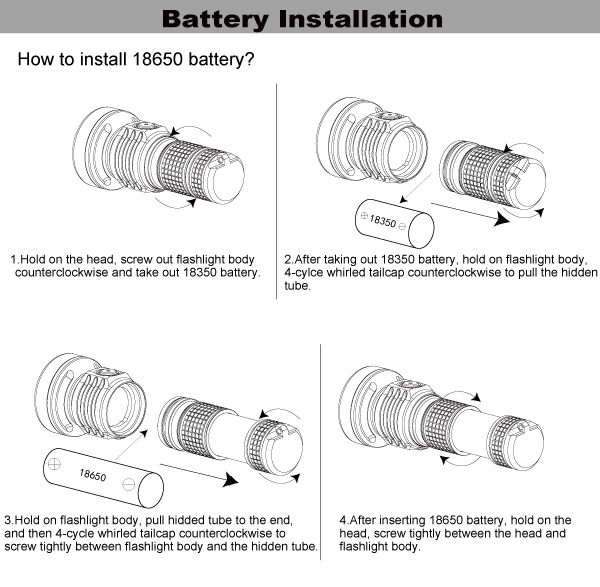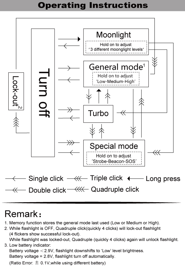 mode, friendly adjust 3 different brightness levels to meet daily requirement - Double click to enter Turbo from any modes (except lock-out mode) - Triple