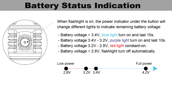 Lower voltage indicator make the light downshifts to low brightness, and avoid light accidentally turn off in dark night ● User-friendly one button interface: -