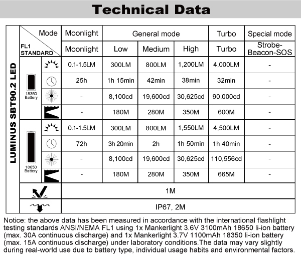 Utilizes 1x LUMINUS SBT90 GEN2 LED Max. 4,500+ lumens output, and 665 meters beam distance Copper light engine for best heat sinking Aluminum