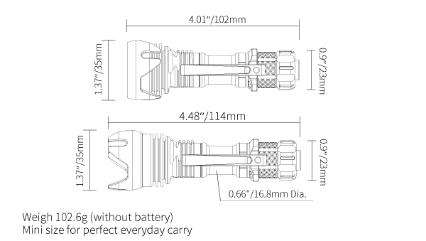 x 16.8 mm (Body diameter) x 23 mm (Tail diameter) • Weight: 102.6 gram or 3.62 oz (Without battery); 124.3 gram or 4.38 oz (with 14500 battery) • Impact Resistance: