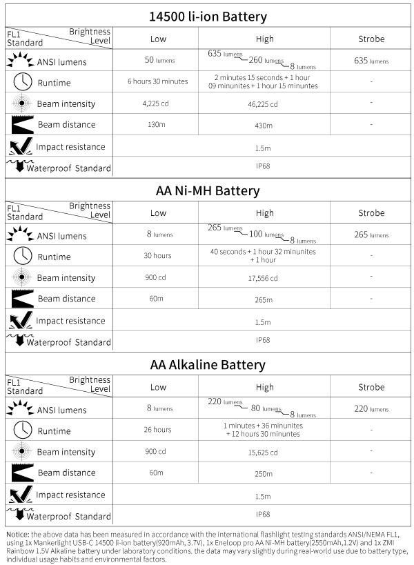 Technical Data Powered by Mankerlight 14500 USB-C li-ion battery: Low: 50 lumens, 6 hours 30 minutes High: 635 lumens ~ 260 lumens ~ 8 lumens, 2 minutes
