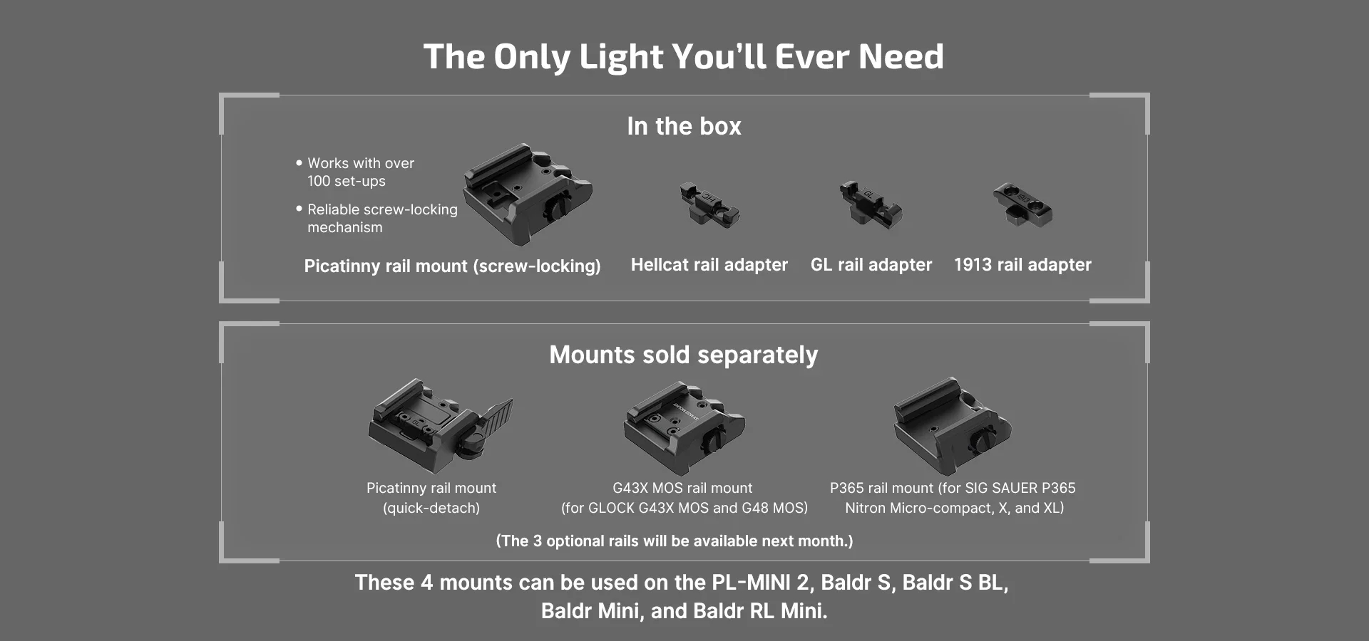 Superior Versatility: Equipped with a preinstalled Picatinny rail mount, and Hellcat, GL, and 1913 rail adapters, plus optional G43X MOS rail, P365 rail, and quick-release rail, this light reaches new heights of adaptability. (The 3 optional rails will be available next month.)