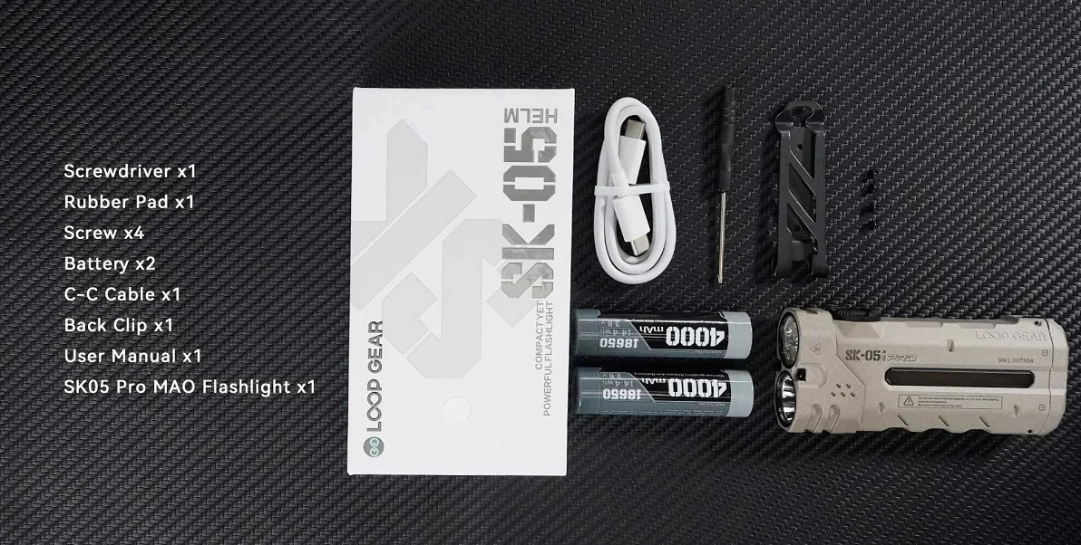Packing: SK05 Pro MAO Flashlight x1 Screwdriver x1 Battery x2 C-C Cable x1 Back Clip x1 User Manual x1
