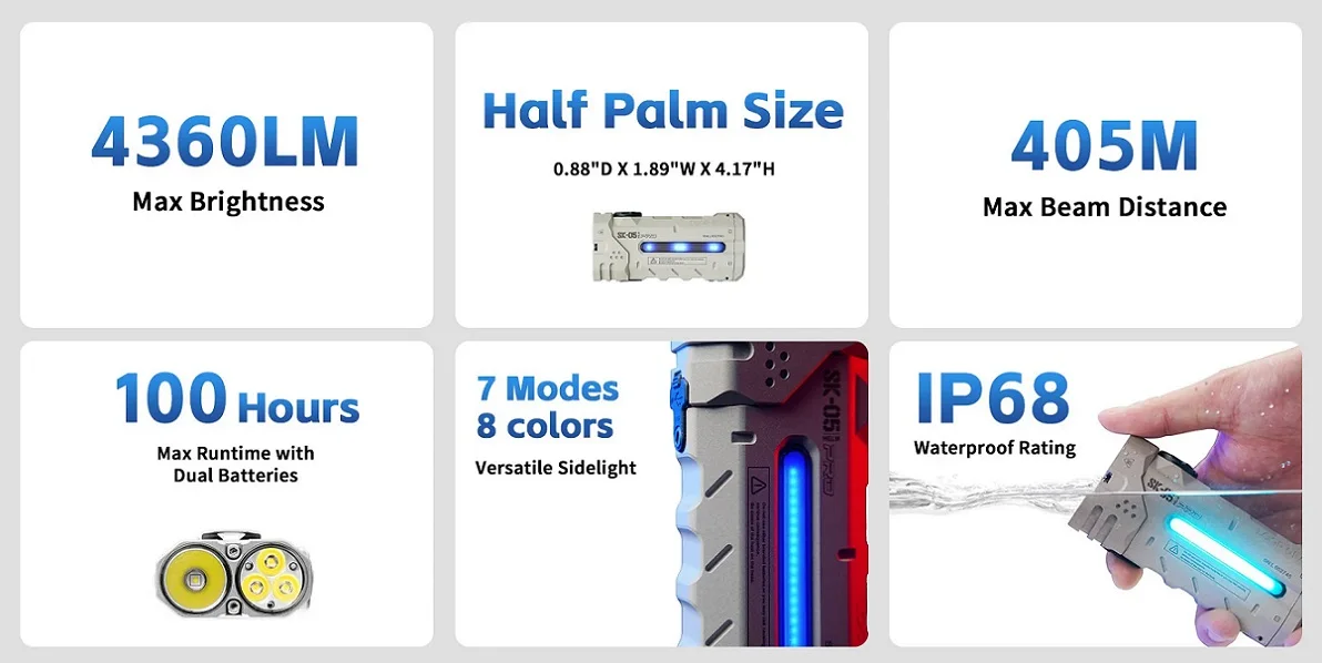 6.4,360 lumens. 405-meter beam. Dual-battery runtime. All in a flashlight that fits in half your palm.