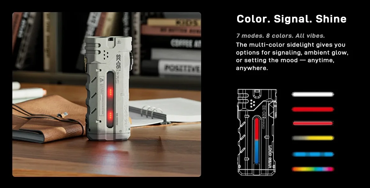 3.Side light with 7 modes & 8 colors — for camping, signaling, or ambient vibes.
