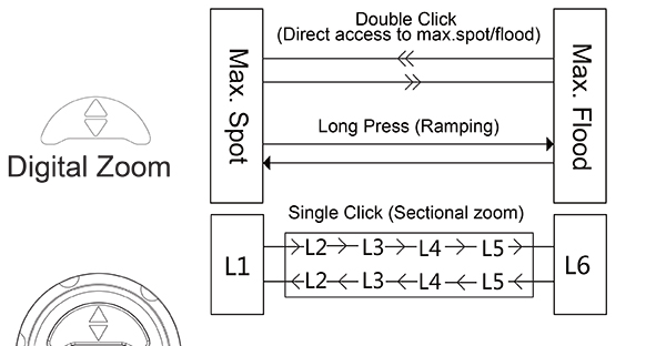 control power / mode operation, another switch control digital zoom operation) - Zoom operation: Ramping, sectional zoom, or direct access to Max.spotlight