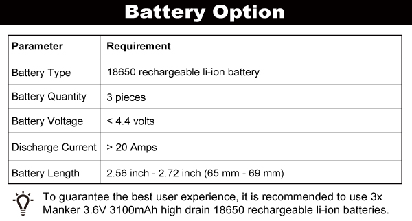 8. Manker recommends using 3x excellent quality high drain 18650 batteries. If you do not know how to select correct battery, we recommend you to buy CROWN -