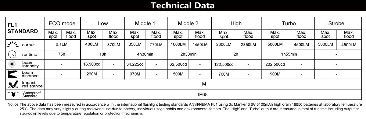 Output/runtime/throw distance ECO mode: 0.1 lumens (Max.spotlight)/0.1 lumens (Max. floodlight) 75 hours