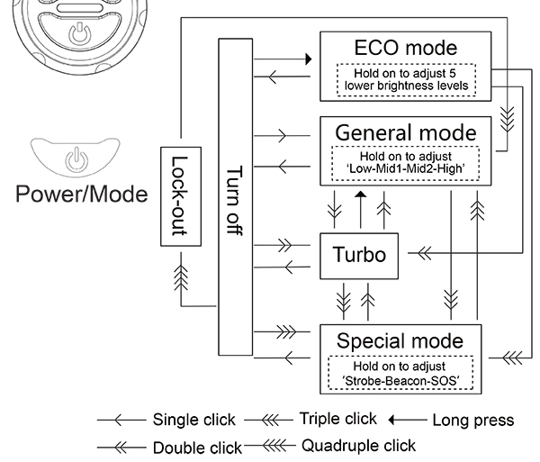 in general mode. After entering ECO mode, single click mode switch to turn it off; double click mode switch to Turbo; quick triple click mode switch to special