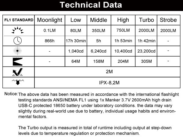 1 hours 53 minutes 204 meters Turbo 2000 lumens 1 hours 42 minutes 305 meters Strobe 2000 lumens