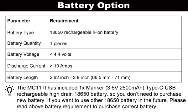 gram (with battery) What's in the package? 1x Manker MC11 II led flashlight 1x Manker 3.7v 2600mAh high drain 18650 rechargeable li-ion battery (integrated