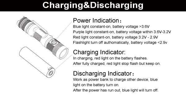 3.6V - 3.2V Red light constant-on, battery voltage 3.2V - 2.9V Flashlight turn off authomatically, battery voltage < 2.9v Battery charging Indicator: In charging,