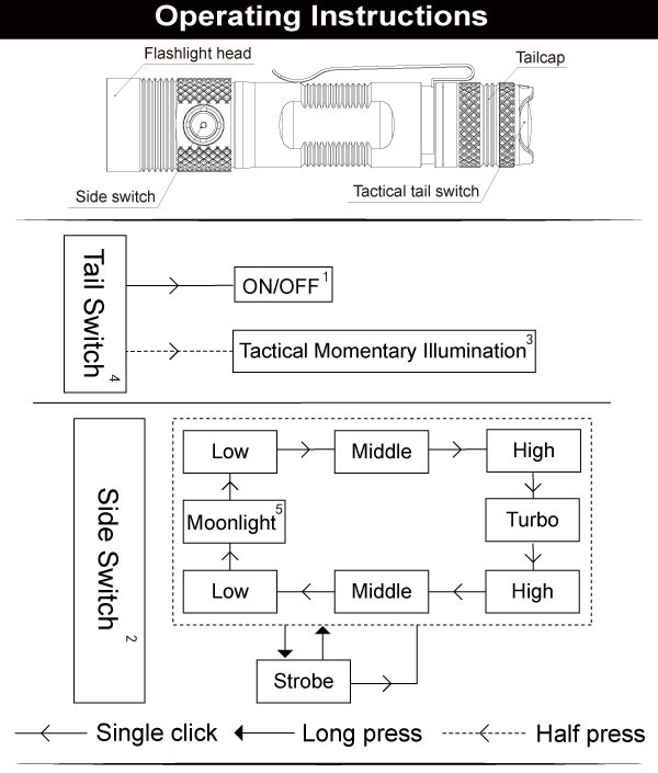 3. Tactical momentary illumination: Half press and hold the tail switch to turn on the light momentarily. Release to turn it off.