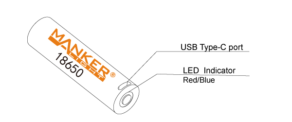 Battery charging indicator: Plug USB Type-C socket of the included charging cable into the USB-C port of 18650 battery, and connect another USB socket to