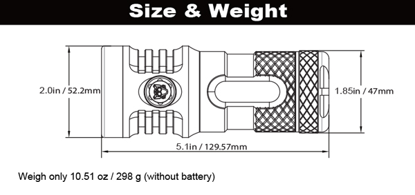 Model No.: MK37 Dimension: 5.06" / 128.57 mm length 2.06" / 52.2 mm head diameter 1.85" / 47 mm body diameter LED Emitter: