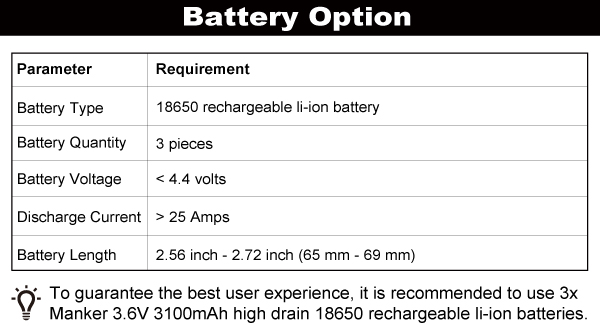 Working Voltage: 8.7V - 12.6V Compatible Batteries: 3 x 18650 (Excluded) Waterproof: IPX-8, 2M Weight: 11.15 oz / 316 gram (without battery),