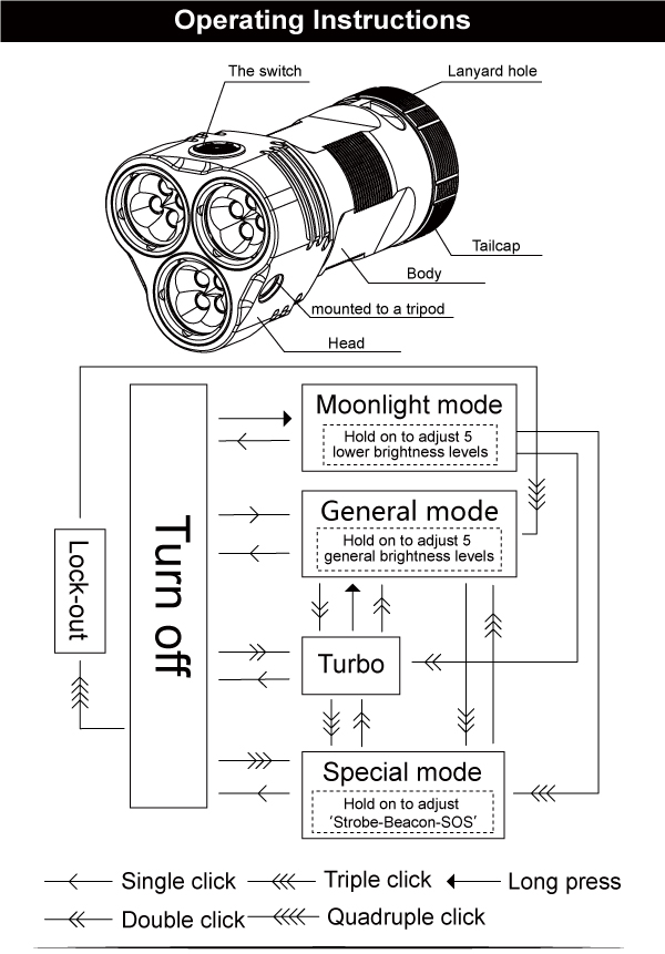 single click switch to turn it off; double click to Turbo; triple click to special mode. Moonlight mode While OFF, long press 1 second to enter moonlight mode.