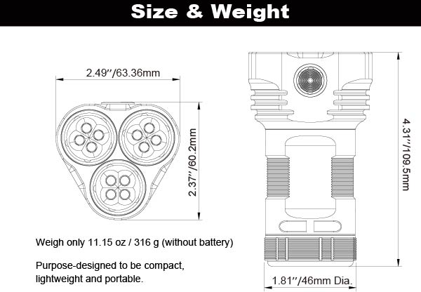 2.37" / 60.2 mm height of triangle (flashlight head) LED Emitter: 12x XHP50.2 CW / 12x SST40 CW/ 12x SST40 NW Max.