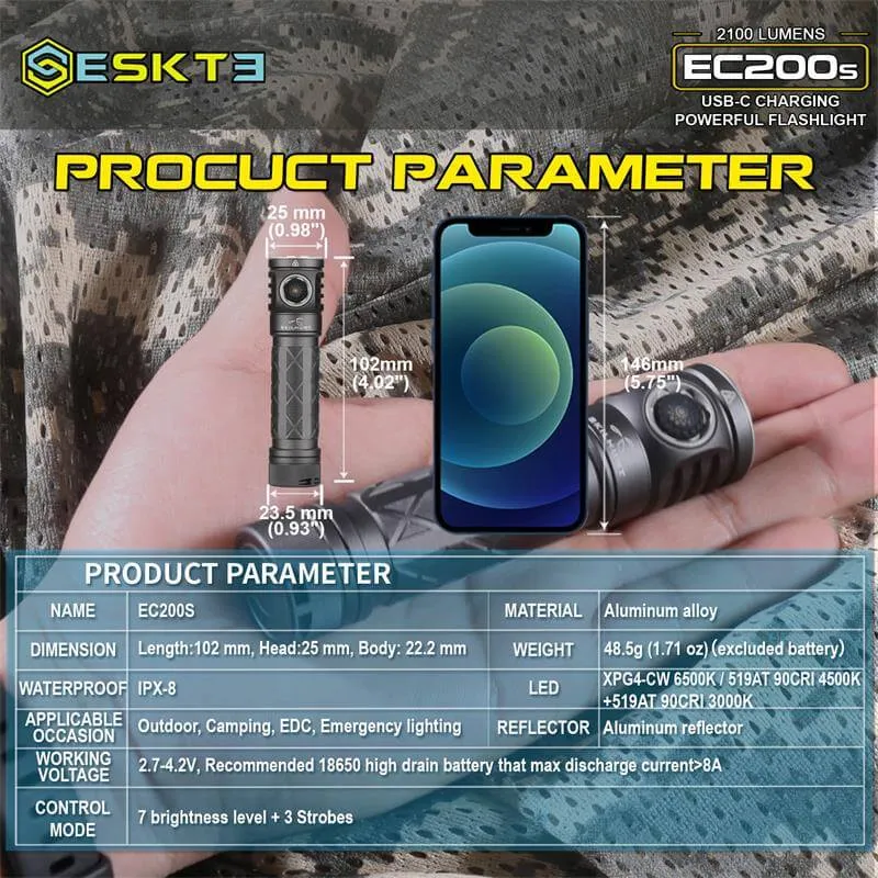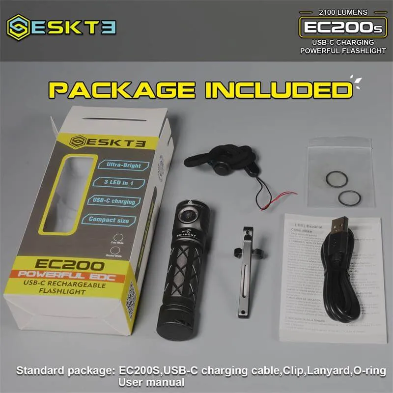 DetailFilter wavelength 565 nm,insects hate wavelength, deter large swarms of bugs and insects in your outdoor activities.Relax Your Eyes: Amber light means less strain.Feel Good: Amber glow helps you chill.Get Cozy: Amber light makes your space warm and inviting.EC200S 2100 + 570 lumens Dual Channel USB-C Rechargeable Powerful EDC flashlightEC200S is a portable and compact multifunctional light with convenient USB-C charging function. Providing powerful white and color light, suitable for various outdoor activities, running, camping, travel, and daily EDC needs as an ideal companion.LED:2 x CREE XP-G4 Cool White 6500K + 1 x Nichia 519A Warm White High CRI R9080 3000K2 x Nichia 519A Neutral White High CRI R9080 4500K + 1 x Nichia 519A Warm White High CRI R9080 3000KMax output:CREE Cool White ANSI 2100 Lumens + Nichia 519A Warm White 570 LumensNichia Neutral White 4500K ANSI 1400 Lumens + Nichia 519A Warm White 570 LumensQuiescent Current (μA) : 55Waterproof: IPX-8Impact resistant: 1 MeterBattery: 1×18650Rated range: 2.7-4.2V, (Recommended 18650 battery that max discharge current ≥8A)Dimension: L102.0 mm / 4.02″, Head diameter 25.0mm / 0.98 “.Weight: 48.5g / 1.71 oz (Excluded battery)Accessories: USB-C Charging Cable, Clip, Lanyard, Spare O-rings, User manual.