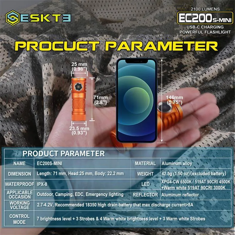 DetailEC200S-Mini 2100 + 570 lumens Dual Channel USB-C Rechargeable Powerful EDC flashlightEC200S is a portable and compact multifunctional light with convenient USB-C charging function. Providing powerful white and color light, suitable for various outdoor activities, running, camping, travel, and daily EDC needs as an ideal companion.LED:2 x CREE XP-G4 Cool White 6500K + 1 x Nichia 519A Warm White High CRI R9080 3000K2 x Nichia 519A Neutral White High CRI R9080 4500K + 1 x Nichia 519A Warm White High CRI R9080 3000KMax output:CREE Cool White ANSI 2100 Lumens + Nichia 519A Warm White 570 LumensNichia Neutral White 4500K ANSI 1400 Lumens + Nichia 519A Warm White 570 LumensQuiescent Current (μA) : 55Waterproof: IPX-8Impact resistant: 1 MeterBattery: 1×18350Rated range: 2.7-4.2V, (Recommended 18350 battery that max discharge current ≥8A)Dimension: L71.0mm / 2.80″, Head diameter 25.0mm / 0.98 “.Weight: 42.5 g / 1.50 oz (Excluded battery)Accessories: USB-C Charging Cable, Clip, Lanyard, Spare O-rings, User manual.