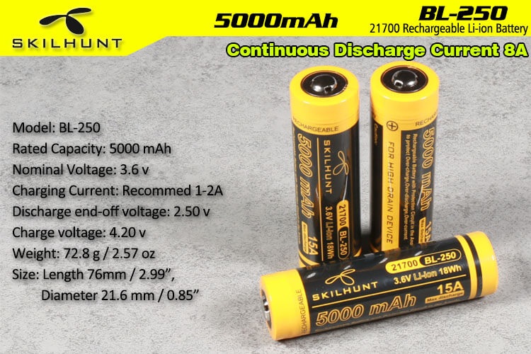 DetailNote: This price is for 1pcs battery.BL-250 5000mAh 21700 Li-ion Rechargeable Protected BatteryContinuous Discharge Current(Max) 8AMultiple protectionPressure relief vent valveMicroporous sepratorShort-circuit ProtectionProtection circuitOver-charge Protection(4.30±0.050V)Over-discharge protection(2.50±0.10V)Over current protection(15~20A)Model: BL-250Rated Capicity: 5000 mAhNominal Voltage: 3.6 vCharging Current: Recommed 1-2ADischarge end-off voltage: 2.50 vCharge voltage: 4.20 vWeight: 72.8 g / 2.57 ozSize: Length 76 mm / 2.99”, Diameter 21.6 mm / 0.85”