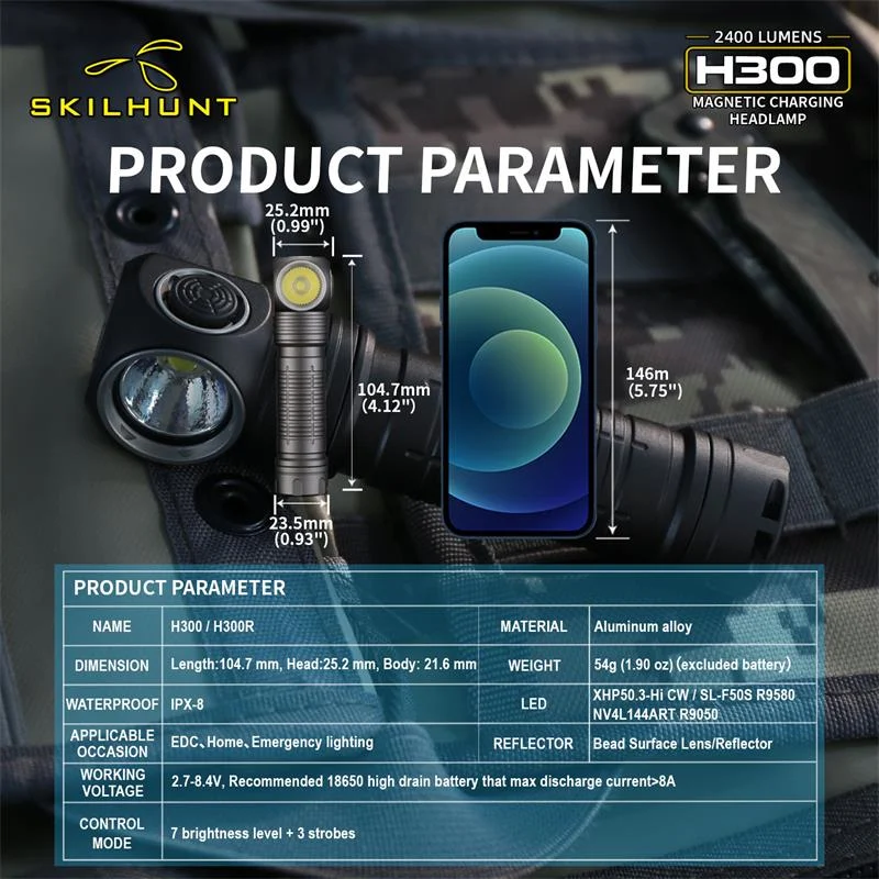 DetailH300 / H300R Led headlamp / FlashlightLED:CREE XHP50.3 HI 6500KNichia 144ART R9050 sm453 4500KSL-F50S R9580 5000KMax output:XHP50.3 HI CW : ANSI 2400 Lumens144ART R9050 : ANSI 1600 LumensSL-F50S R9580: ANSI 1650 LumensMax beam distance:H300R:11500cd(HI CW), 7700cd (F50S)H300: 5400cd (144ART)Max peak beam intensity:H300R: 214 m (HI CW), 175 m (F50S)H300: 146 m (144ART)Waterproof: IPX-8Impact resistant: 1 MeterBattery: 1×18650 , 2x CR123ARated Range: 2.7V ~ 8.4VWeight: 54g / 1.90 oz (without battery)Dimension:Length 104.7mm(4.12 inch)Head diameter 25.2mm (0.99 inch) /Body diameter 21.6mm(0.85 inch)Weight: 54g / 1.90 oz (without battery)Accessories: Headband, clip, lanyard, magnet replace rubber pad, Operator’s manual, Spare O-ringBattery installationPlease make sure that the positive pole of the battery points to the head of the flashlight when you replace the battery.