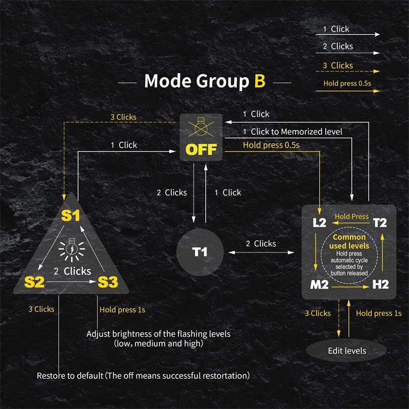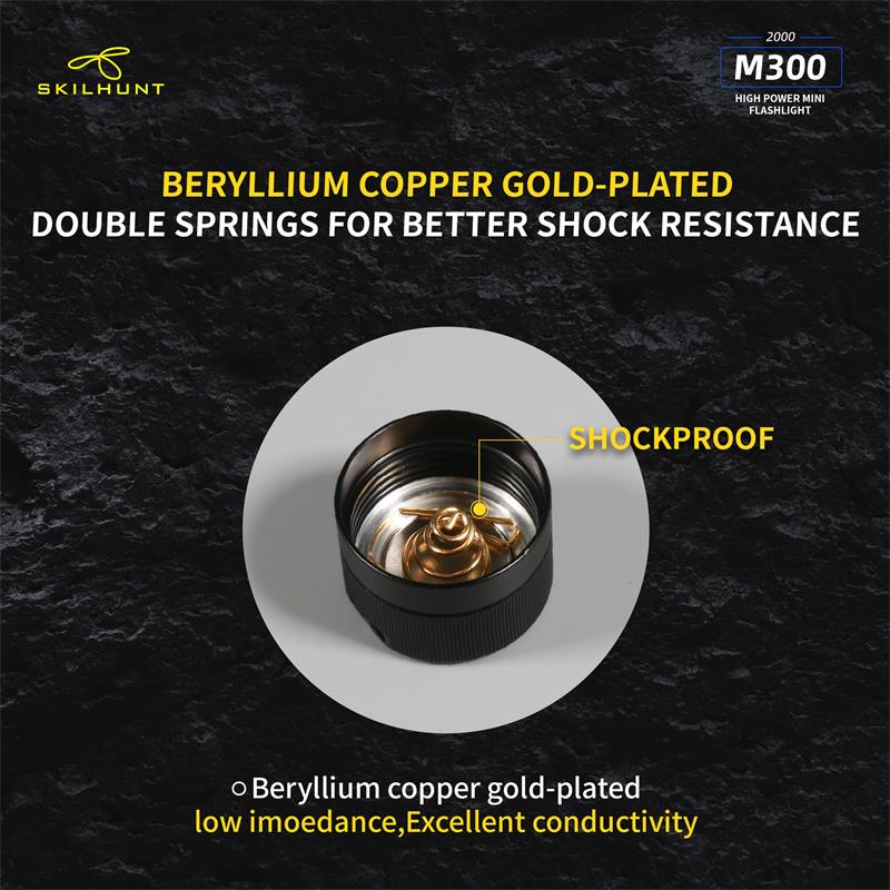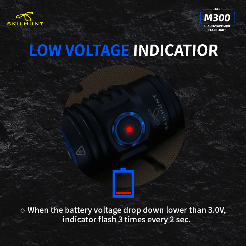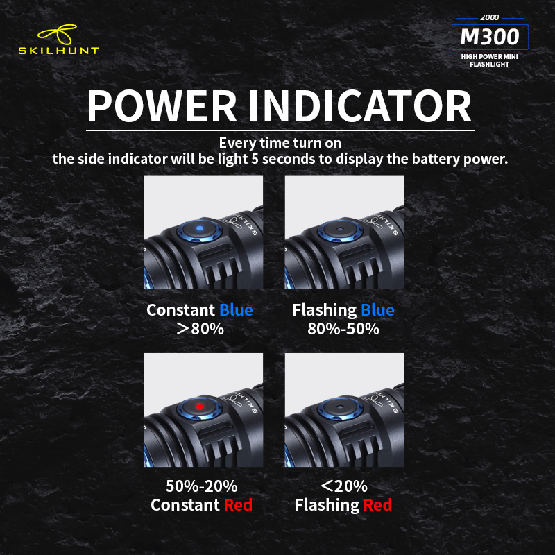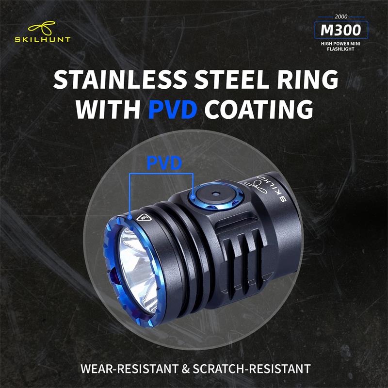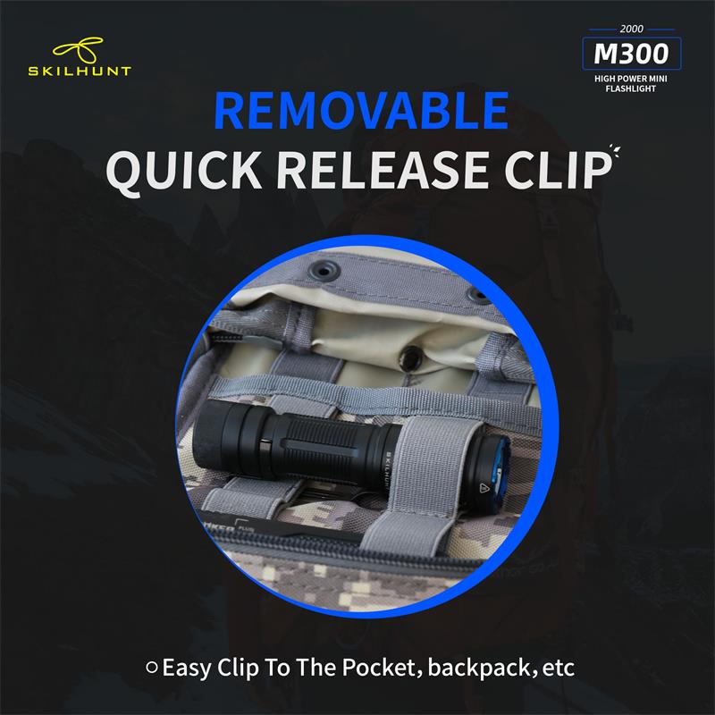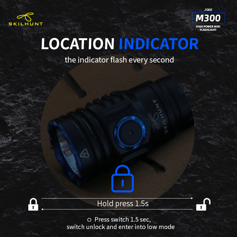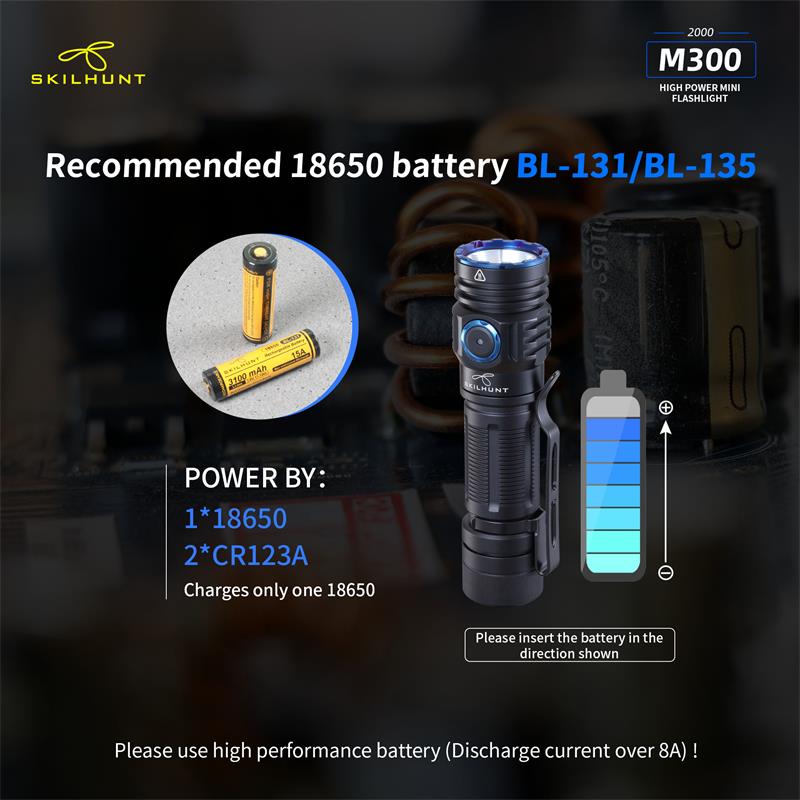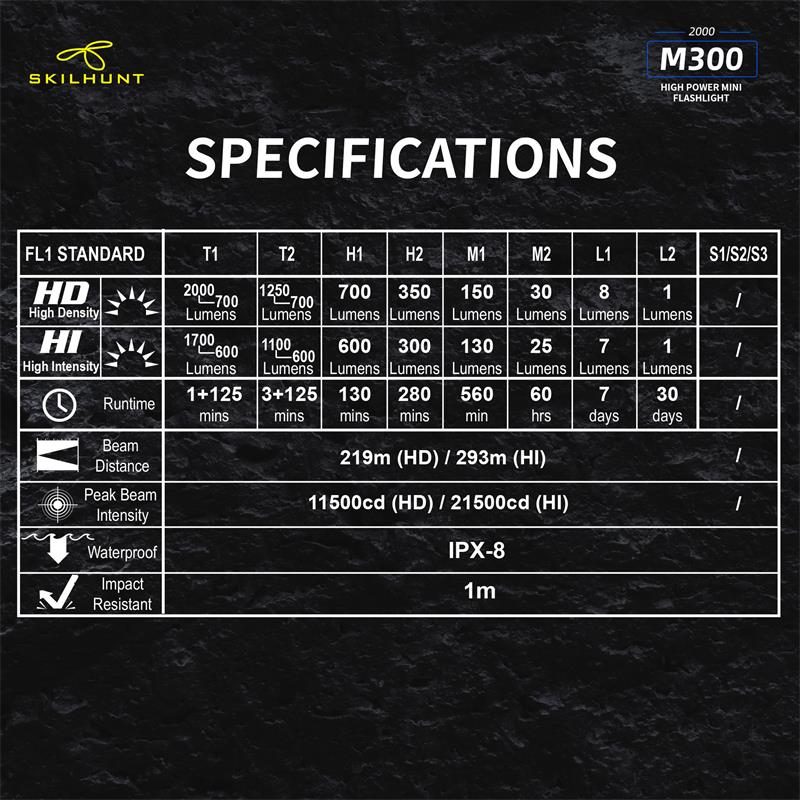 DetailM300 XHP35 2000 Lumens EDC Edition LED FlashlightLED: CREE XHP35 HD / HIMax output:HD: ANSI 2000 LumensHI: ANSI 1700 LumensMax runtime: 30 daysMax beam distance: HD: 219 meters HI: 293 metersMax peak beam intensity: HD: 11500 cd HI: 21500 cdWaterproof: IPX-8Impact resistant: 1 MeterBattery: 1×18650 , 2 × CR123ARated Range: 2.7V ~ 8.4VDimension:Length 111 mm / 4.37 inchHead diameter 28 mm / 1.19 inchBody diameter 23 mm / 0.9 inchWeight: 72.5 g / 2.56 oz (without battery)Accessories: User manual,Spare O-rings,Lanyard,Clip, Magnetic Charging Cable .OperationBattery installation & Replace magnet: Insert the battery into the flashlight,the battery positive pole toward the light head.Ensure batteries are inserted correctly, the flashlight will not operate with incorrectly inserted batteries. Ensure when the light turning on,the beam is directed away from the eyes.When take the light with Bankcards(magnetic) or Cell phone,should replaced Magnet with rubber pad.Turn ON/OFF & Mode transferTransfer Mode A / Mode B:When flashlight is turned off without lockout, hold press side switch 5 seconds, light will flash three times faster then flash three times slow.Mode Group AWhen the flashlight was OFF status:Click switch to memorized brightness level.Quickly double click switch to Turbo(T1/T2).Quickly triple click switch to Strobe(S1) mode.Press switch 0.5 second to Low(L1/L2) mode.When the flashlight was ON(any mode) status:Press and hold the side switch 0.5 second to turn off.Brightness & mode selection:Brightness level:Press side switch to Low-Mid-High-Turbo, cycle.Quickly double press the side switch to Sub-level(i.e between L1 & L2), turn off memorized the last brightness.Quickly triple press to Special modes.Special modes:Quickly triple press the side switch to Strobe (S1), then double-click to switch S1/S2/S3 mode, Press side switch back to previous brightness level.Mode Group BWhen the flashlight was OFF status:Click switch to memorized brightness level.Press switch 0.5 sec,to L2.Quickly double click switch to Turbo(T1) mode.Quickly triple press to Special modes(S1).When the flashlight was ON(any mode) status:Click switch to turn off.On Common used levels(Editable):Hold press switch, brightness levels automatic cycle, and selected mode by button released. Click switch to turn off.Quickly triple press enter to Edit levels.On Special modes:Quickly double click switch to transfer mode S1/S2/S3,click switch to turn off.Hold press side switch 1 second to adjust the S1/S2/S3 brightness output level in Low, medium or high.Quickly triple press to restore to the factory default flash modes.Edit Levels:— Support to 2 ~ 7 common used levels can be selected–Enter to edit level, 7 levels circle automatically. The selected level, side switch indicatior is on. Not selected brightness, side switch indicator is off.–Factory’s default levels: L2-M2-H2-T2. The indicator light on synchronously when levels automatic cycles.–Selected / Not selected brightness, Click side switch to turn on / off the corresponding indicator.-. All selected finished, hold press 1 second the side switch save selected and quit edit mode. The light will be flash three times, and back to the lowest selected level.-. Restore the factory default levels: Enter to edit level, then click side switch three times. (Light will be turn off after three clicks.)Location indicator & Lock-out functionWhen turn off the flashlight, press switch 1.5 second,location indicator switch on and lock-out function activation at same time,click double click the switch to turn on/off the indicator, the indicator light flash every second, locate the flashlight, Easy find the flashlight in the dark quickly.Press switch 1.5 sec, switch unlock and enter into low mode.Power indicatorEvery time turn on , the side indicator will be light 5 seconds to display the battery power.Blink four times : battery power in 100%~80%;Blink three times : battery power in 80%~50%;Blink twice : battery power in 50%~20%;Blink one time : battery power below 20%.Charging instructions and noticesIn charging, the red indicator constant light on, when battery almost full charge, indicator change to constant blue light. When the red indicator flash, please check battery contacts good or not.Warning: Rechargeable function only for one 18650 (3.6/3.7V) rechargeable lithium battery! Please make sure the battery is correctly insert, otherwise it will damage the charging system.Turbo T1 is accessible by 18650 at load voltage ≥ 3.6V, is inaccessible by 2 x CR123A batteries!