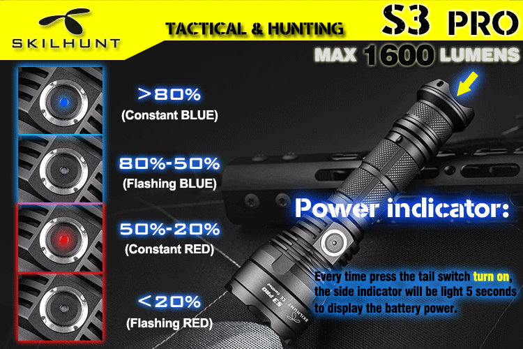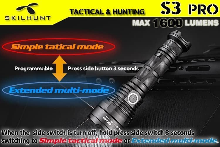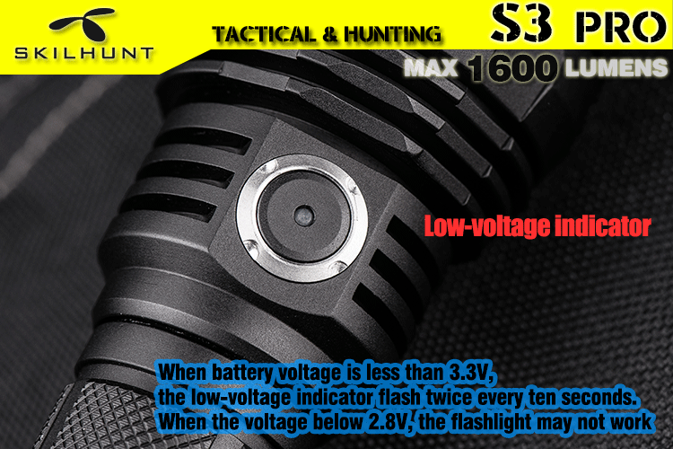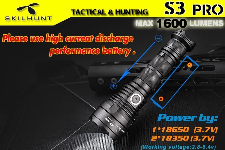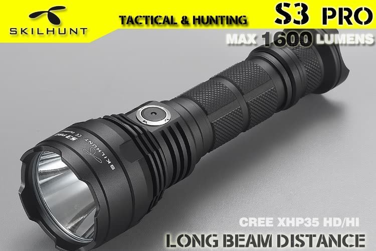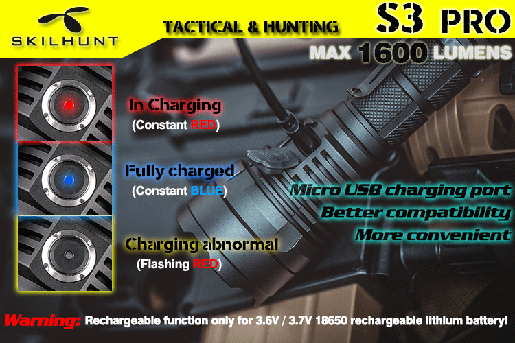 DetailS3 pro HI / HD USB rechargeable tactical LED flashlightLED: CREE XHP35 HD / HIMax output: 1600 Lumen / 1400 LumenMax runtime: More than 1 monthMax beam distance: 404 meters / 521 metersWaterproof: IPX-8Impact resistant: 1 MeterBattery: 1×18650Rated Range: 2.8V ~ 8.4VUSB charge: 5V 1AWe recommend to use a 18650 lithium battery with excellent discharge performance.Dimension:Length 143.7mm/5.66inchHead diameter 36.0mm/1.41inchBody diameter 25.4mm/1.0inchWeight: 125g /4.4oz(exclude battery)Accessories: Operator’s manual, Spare O-rings, Spare Tail cap Rubber Boot, USB cable, clip, lanyardOperationNote for battery installation: Make sure that insert the battery with the positive end toward the head. Otherwise the torch will not turn on properly.Please do not point the flashlight to the eyes of people or animals, that may affect vision.Flashlight turning on/off, Brightness and Modes switching (Simple tactical mode and Extended multi-mode):– Gently press(no click) the tail switch to momentary light; Full press (clip) the tail switch then locked to turn on or turn off the flashlight.When the tail switch is locked on, hold press side button 0.5 seconds to turn off, And then hold press side switch 3 seconds to switching to simple tactical mode or extended multi-mode.– Simple tactical mode (the main light flashes 3 times when switching to this mode):When the tail switch is locked on:Click the side button to change brightness : Low L1 – Medium M1 – High H1 – Turbo T1, Cycle;Quickly double-click the side button directly into the S1 Strobe, click back to last used brightness;Hold press the side button 0.5 seconds into turn off state:Click side button to Turbo T1 brightness; Quickly double-click to S1 Strobe; Hold press side button 0.5 seconds to Low L1 brightness;When Full press tail switch turn off:Full Press tail switch again turn on to memory last used setting.《《《《《《《—————-Hold Press side button 3 seconds to switching ——————–》》》》》》– Extended multi-mode (the main light flashes 1 time when switching to this mode):When the tail switch is locked on:Click the side button to change brightness : Low L1 – Medium M1 – High H1 – Turbo T1, Cycle;Quickly double-click the side button to switch Sub-level(i.e between L1 & L2), turn off memorized the last used brightness.When flashlight in brightness mode, quickly triple press the side button to Strobe (S1), then double-click to switch S1/S2/S3 mode, Press side button back to previous brightness Or turn off memorized the previous brightness.Hold press the side button 0.5 seconds into turn off state:Click side button to last used brightness; Quickly double-click to Turbo brightness; Hold press side button 0.5 seconds to Low brightness; Quickly triple press the side button to Strobe mode.When Full press tail switch turn off:Full Press tail switch again turn on to memory last used setting.Power indicator: Every time press the tail switch turn on , the side indicator(blue or red light) will be light 5 seconds to display the battery power.Constant Blue : battery power in more than 80%;Flashing Blue : battery power in more than 50%;Constant Red : battery power in more than 20%;Flashing Red : battery power below 20%, the power is about to run out.Low-voltage indicator:When battery voltage is less than 3.3V, the low-voltage indicator flash twice every ten seconds; when the voltage drops to 3V, the low-voltage indicator flash three times every few seconds, prompts to replace the battery as soon as possible;When the voltage below 2.8V, the flashlight may not work (flashing or shutting down).charging instructions and notices:Please turn on the flashlight tail switch before charging, the main lights will automatically turn off when charging.In charging, the red indicator constant light on, when battery almost full charge, indicator change to constant blue light, please charge more half hour to make sure battery full charge.When the red indicator flash, please check battery installed correct or not, flashlight contacts good or not.When the flashlight is connected to the power supply or power bank via the MICRO USB cable, the flashlight will still work (except for Turbo mode).Tips: Rechargeable function only for the nominal voltage of 3.6V / 3.7V 18650 rechargeable lithium battery!