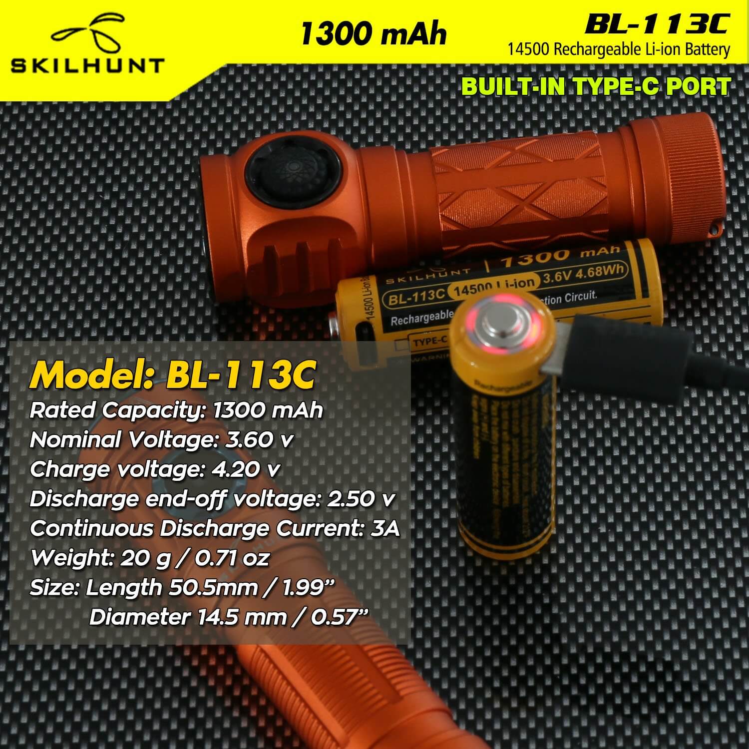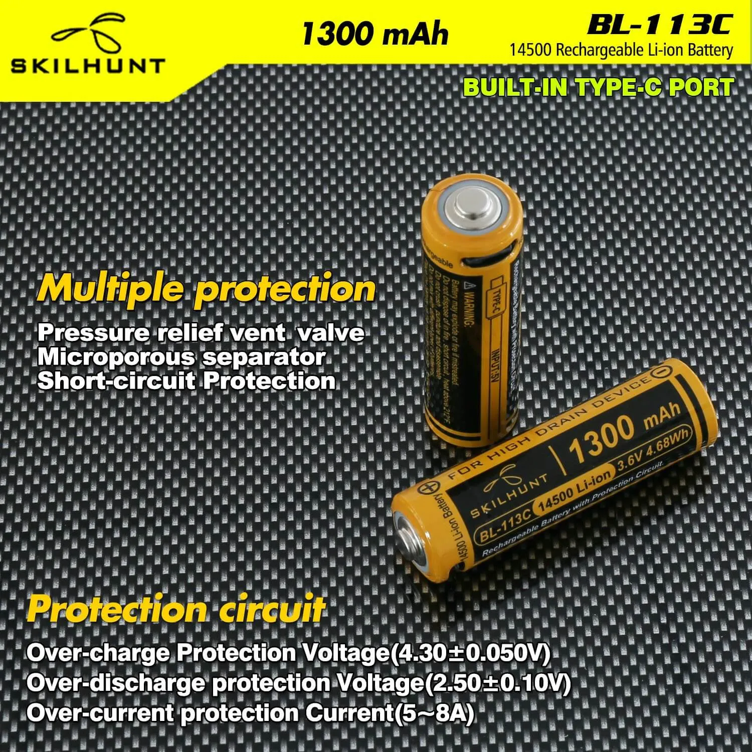 SKILHUNT BL-113C 1300mAh 14500 Built-in USB-C Port Protected Battery