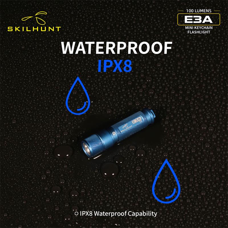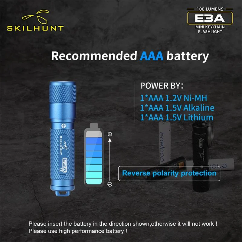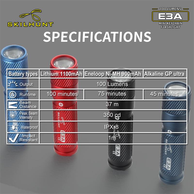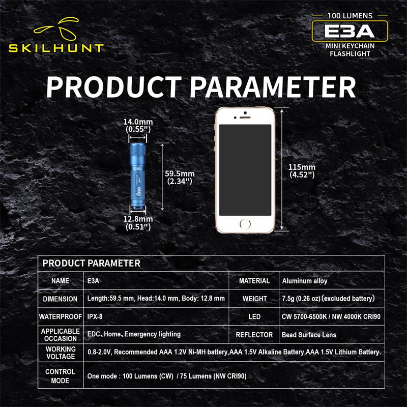 DetailE3A keychain LED flashlightMax output: ANSI 100 LumensMax runtime: 100 minutesMax beam distance: 37 metersMax peak beam intensity: 350cdWaterproof: IPX-8Impact resistant: 1 MeterBattery: Uses 1xAAA 1.5V Alkaline , 1xAAA 1.2V Ni-MH or 1xAAA 1.5V LithuimRated Range: 0.8V ~ 2VDimension:Length 59.5 mm / 2.34 inchHead diameter 14.0 mm / 0.59 inchWeight: 7.5 g / 0.26 oz (without battery)Included: 1x E3A, 1xAAA Alkaline battery, Keyring, Operator’s manual, Spare O-ringOptional: Key holderOperationBattery installation: Insert the battery positive pole toward the light head, otherwise it will not work.When the light turning on, the beam is directed away from the eyes.Take out the battery if you are storing the flashlight for a lont period of time to prevent the battery from leaking.Flashlight turning on/off:Fully tighten the tube/tail to turn the light on.Twist the tube/tail to turn off the light.FeaturesPowered by a convenient and widely available single AAA battery producing an output of 100 lumens.Made by durable aluminumExtremely easy carry: Barely know it is there with its lightweight and small size.Waterproof to IPX-8 StandardTIR optic lens producing a soft and balanced beam for comfortable use.