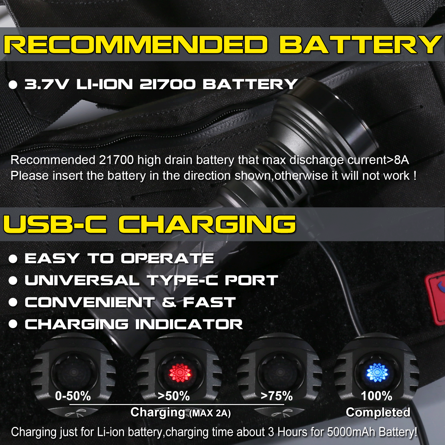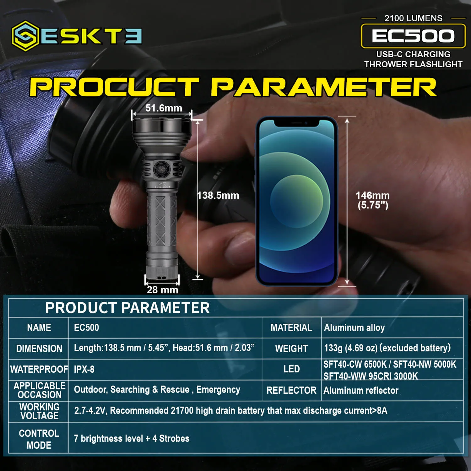 SKILHUNT EC500 2100 Lumens 21700 USB-C Rechargeable Long-Range Flashlight