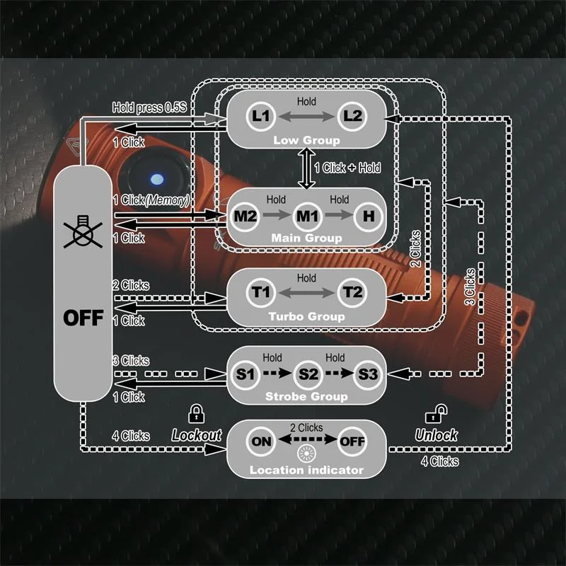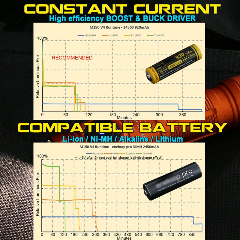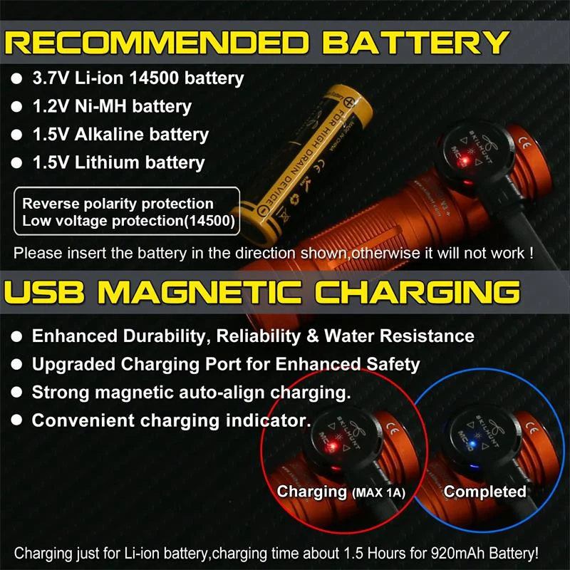 DetailLED: TN Cool White 5700K~6500K /SFT25R-HI 5700K~6500K/ Neutral White Nichia 519A CRI90 5000K/4000K /Warm White Nichia 519A CRI90 3000KMax runtime: Few monthsMax beam distance:14500: 230m (HI) / 134m (CW) / 114m (5000K) / 113m (4000K) / 101m (3000K)Ni-MH: 131m (HI) / 72m (CW) / 62m (5000K) / 60m (4000K) / 54m (3000K)Max peak beam intensity:14500: 13300cd (HI) / 4500cd (CW) / 3300cd (5000K) / 3200cd (4000K) / 2600cd (3000K)Ni-MH: 4300cd (HI) / 1300cd (CW) / 980cd (5000K) / 920cd (4000K) / 750cd (3000K)Waterproof: IPX-8Impact resistant: 1 MeterBattery: 1×14500 , 1x AARated Range: 0.8V ~ 4.2VDimension:Length 84.0mm / 3.30 inchHead diameter 21.0mm / 0.82 inchWeight: 34 g / 1.20 oz (without battery)Accessories: User manual,Spare O-rings,Lanyard,Clip, Magnetic Charging Cable .Battery installation :Insert the battery positive pole toward the light head,otherwise it will not work.