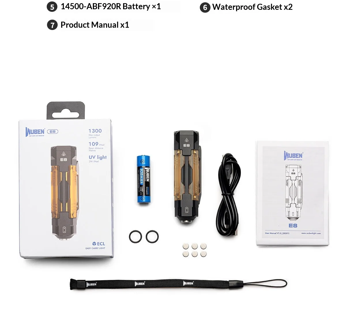 WUBEN E8 Latest Outdoor EDC Lightweight Flashlight 1300 Lumens Aluminum Alloy Portable 36-Hour Battery Life IP68 Waterproof